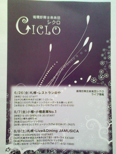 ピリカミュージックさんから、アルバム「シクロ」の「循環即興古楽楽団シクロ」ライブ情報をいただいたのでメモ。