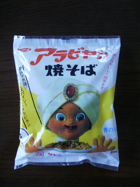 “Arabian Yakisoba”, I wonder if they ever have a habit of eating fried noodles in Arabic countries? Does the image on the package look like an Indian wearing turban?