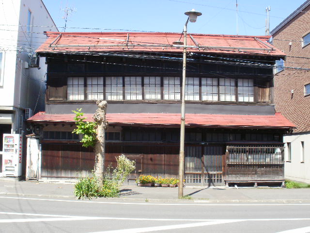 The image is a typical old-time merchant house in Wakamatsu. The part of the brown wooden sliding doors must have been a shop. I have no idea what business this shop did, but it is quite interesting to see the building like this still remaining even long after they closed the business.