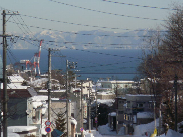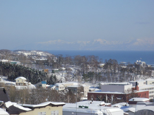 Mashike range of mountains sometimes can be seen on a sunny day beyond Ishikari Bay at this time of year.