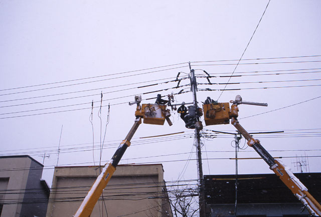 高い所で作業をしている。
