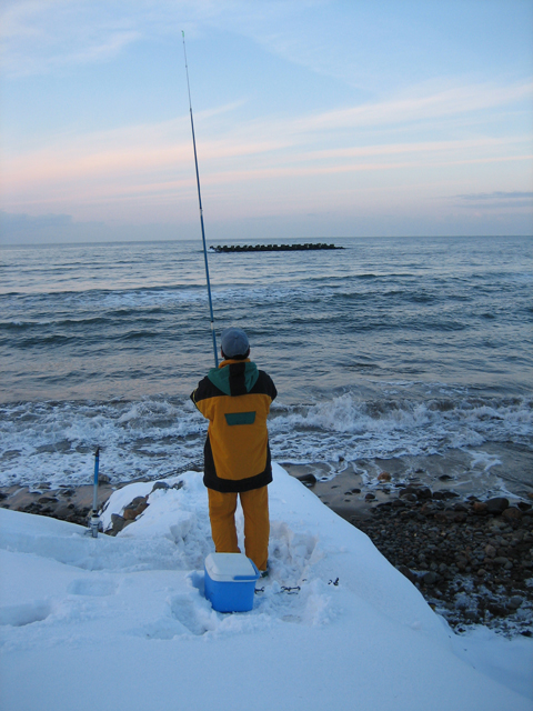 完全防寒の釣り師が竿を放っていた。